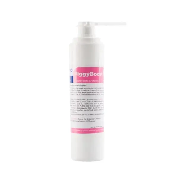 PiggyBoost está diseñado para lechones recién nacidos débiles y ligeros. Proporciona energía de disponibilidad inmediata, estimulantes, una mezcla de vitaminas y probióticos.
