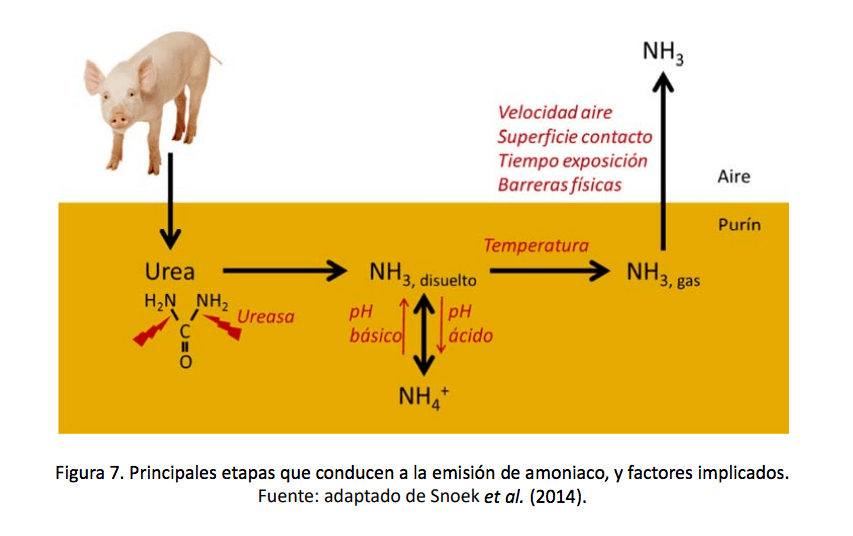 El amoniaco es un gas que se libera en los procesos de descomposición de los estiércoles. A partir de la descomposición de la urea excretada en la orina de los animales por la acción de la enzima ureasa, presente en las heces de los animales, en cuestión de horas se transforma en amonio. Por cada plaza de cerdo de cebo se excretan cerca de 10 kg de Nitrógeno cada año, de los cuales el 72% es a través de la orina. El amoniaco generado es un compuesto químico sujeto a un equilibrio ácido-base. La solubilidad del amoniaco se reduce al aumentar la temperatura, es decir, temperaturas altas aceleran la fase de emisión.
