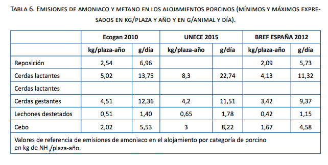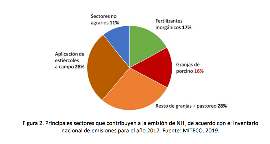 En ese año las granjas de porcino fueron responsables de unas 82.500 toneladas de amoniaco emitido a la atmósfera (un 16% del total nacional), sin contar con las emisiones producidas por los purines en su aplicación al campo, con lo que se alcanzaría un valor cercano al 30%.