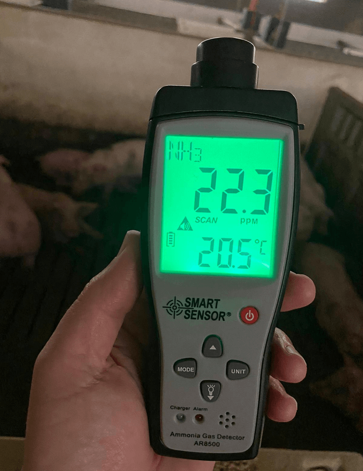 El NH₃ es un gas que no se ve, solo se huele. Se acumula en el interior de los alojamientos porcinos mal ventilados. Es irritante, genera picor de ojos y de vías respiratorias.